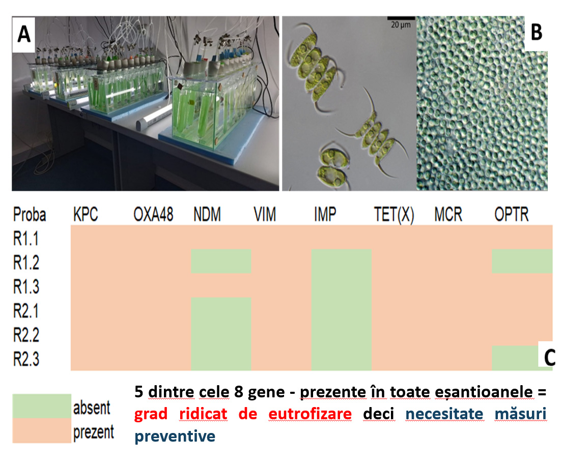 - Prevenirea/combaterea înfloririlor acvatice toxice (A) prin utilizarea unor alge verzi (Desmodesmus – B stânga) şi cianobacterii (Microcystis – B dreapta)